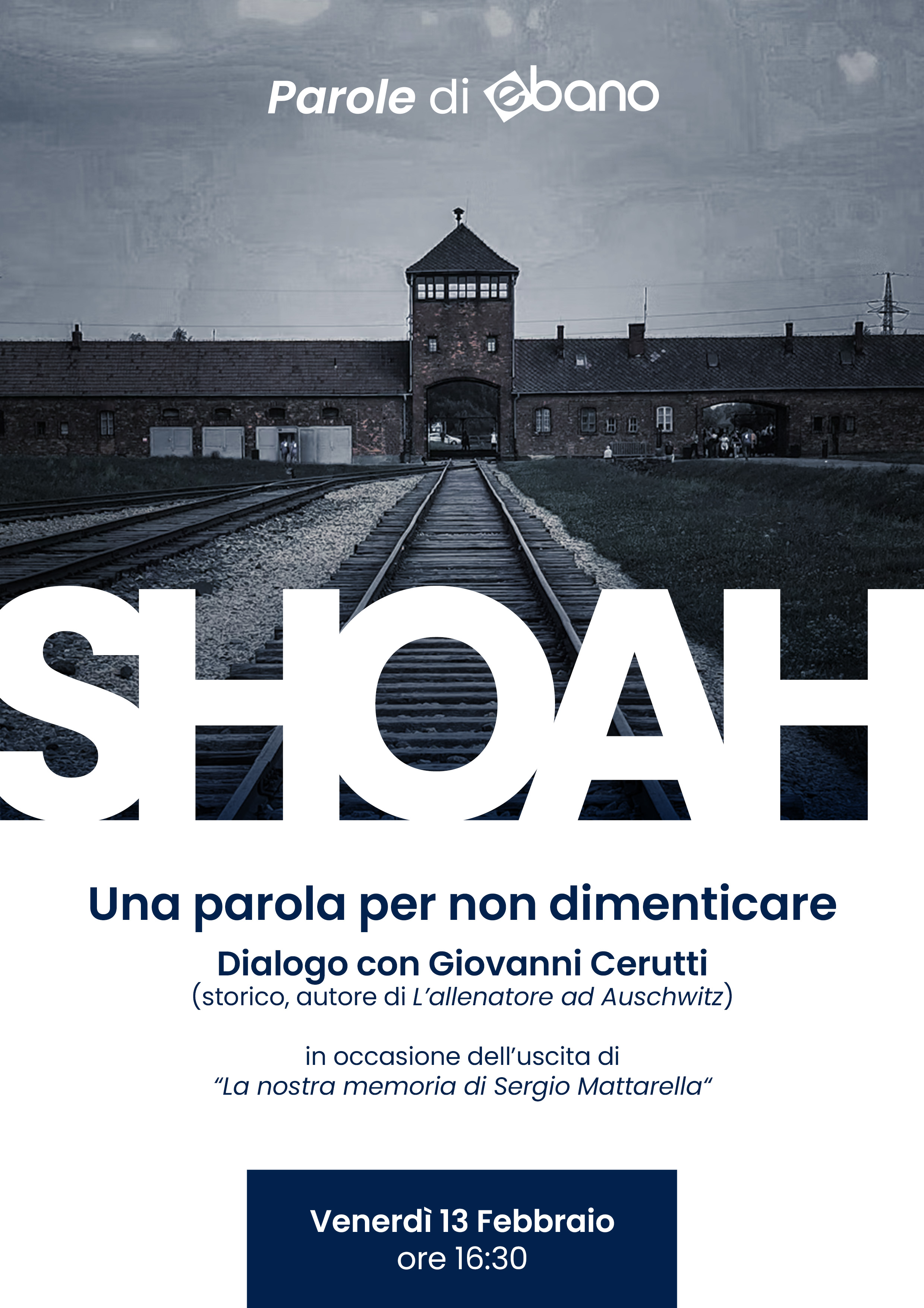 Per il ciclo "Parole di Ebano" in occasione dell’uscita della raccolta di Sergio Mattarella La nostra memoria. I discorsi per non dimenticare la Shoah, con un testo di Liliana Segre, il Gruppo Ebano organizza un incontro-webinar dedicato al significato della parola "Shoah" e all’importanza della memoria, con un dialogo tra Roberto Cicala e Giovanni Cerutti, storico e autore del volume L’allenatore ad Auschwitz.